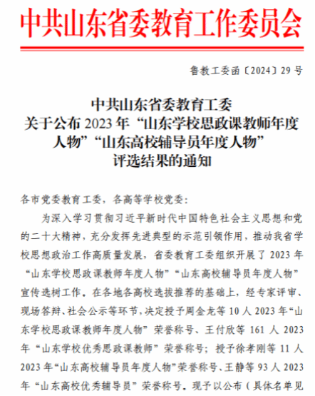 近日,山东省教育厅(省委教育工委)公布了《2023年度“山东学校思政课教师年度人物”和“山东高校辅导员年度人物”宣传选树活动评选结果》,经过地市(高校)推荐、材料审核、专家评审、现场答辩、社会公示等环节,我校马克思主义学院刘晓燕老师获评“山东学校优秀思政课教师”,信息工程学院李白玉老师获评“山东高校优秀辅导员”。