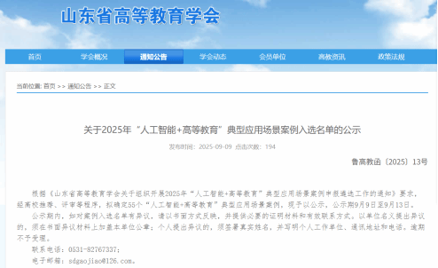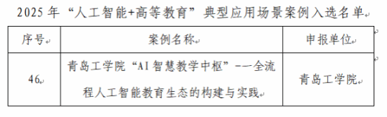 近期,山东省高等教育学会公布了2025年“人工智能+高等教育”典型应用场景案例,学校申报的《青岛工学院“AI智慧教学中枢”--全流程人工智能教育生态的构建与实践》成功入选。
