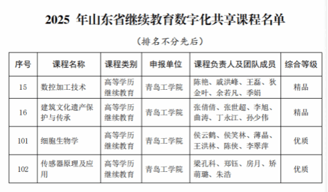 2025年12月31日,山东省教育厅发布了《关于公布2025年度继续教育数字化共享课程遴选结果的通知》(鲁教民函[2025]15号)。我校申报的《数控加工技术》《建筑文化遗产保护与传承》《细胞生物学》《传感器原理及应用》4门课程全部成功入选,获批认定为省级数字化共享课程。其中,《数控加工技术》《建筑文化遗产保护与传承》2门课程获评“精品课程”,《细胞生物学》《传感器原理及应用》2门课程获评“优质课程”。至此,我校已连续三年申报课程悉数入选,累计达12门,入选数量与质量持续位居全省同类高校前列,充分彰显了学校在继续教育领域的扎实基础和资源建设的强劲实力。