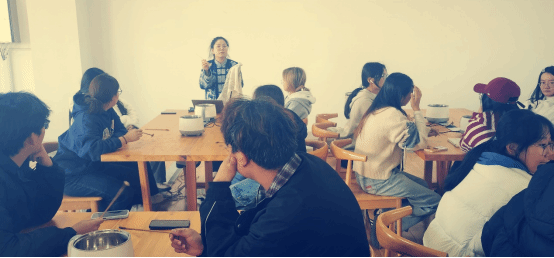 王老师以《蓝白流转:蜡染技艺的千年传承与美学密码》为题展开深度分享。她手持一块清代苗族蜡染背扇,指尖轻拂布面的冰裂纹,现场展示融蜡施蜡的核心技法,并细述浸染之道。实操环节,王老师取一块素白绢布固定在木框上,以炭火微微加热布面,随后执起一支尖细蜡刀,蘸取琥珀色蜡液,手腕轻转间,一朵缠枝莲纹样便在布上渐显雏形,蜡线粗细均匀如绣线勾勒。待蜡纹干透,再将绢布轻轻浸入蓝靛染缸,布面与靛液接触的瞬间,气泡细密升腾,如繁星坠入深海;静置片刻后取出,原本洁白的布面已染上浅蓝底色,在阳光下泛着温润光泽,脱蜡后再将布帛放入沸水,蜡层遇热融化,蓝白分明的纹样惊艳呈现。