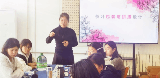 茶艺老师手持一卷清代小篆茶帖,指尖轻拂笔墨,现场示范小篆书写技法,并取少许碧螺春茶叶,轻铺于底板之上,借茶形模拟山水、花鸟,再以篆字题跋点睛,让作品兼具视觉之美与文化之魂。实操环节中,师生纷纷化身传统文化的践行者,有人偏爱清雅意境,取龙井茶叶拼缀出 “竹影清风” 的轮廓,叶片舒展如竹枝摇曳,再以小篆题 “茶烟轻飏” 四字于旁,墨色与茶绿相映,尽显文人雅趣;有人聚焦经典纹样,用祁门红茶与普洱熟茶拼出传统回纹,红褐交织间透着古朴庄重,辅以小篆 “和” 字,传递 “茶和天下” 的东方哲思;还有老师则以 “二十四节气” 为主题,取对应时节茶叶拼出节气符号,旁书小篆节气名,让茶韵、篆香与时令之美完美契合。