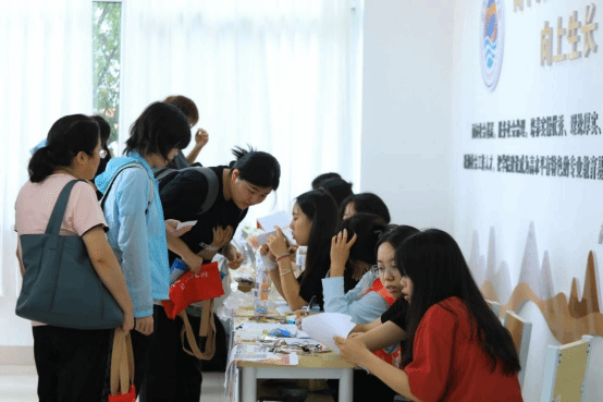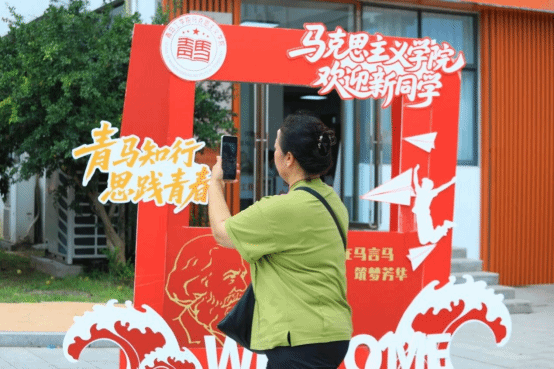报到点旁,学院特别设置了“入学打卡点”,背景板印有“青马知行 四践青春”的标语。新生们笑容灿烂地按下快门,与青春洋溢的脸庞相映成趣,记录下人生新起点。