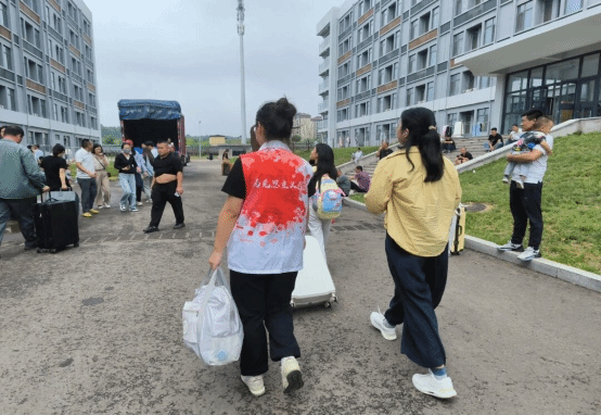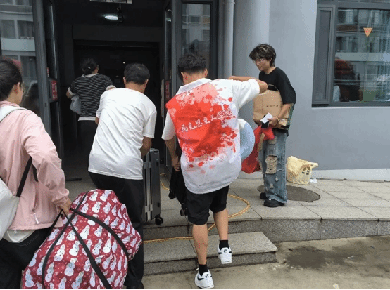 志愿者引导新生领取军训物资,并带他们前往宿舍。宿舍内已备好空调、行李架、衣柜等,确保生活便利舒适。此外,每层楼还配备了公共洗衣机、吹风机和饮水机。