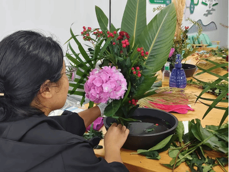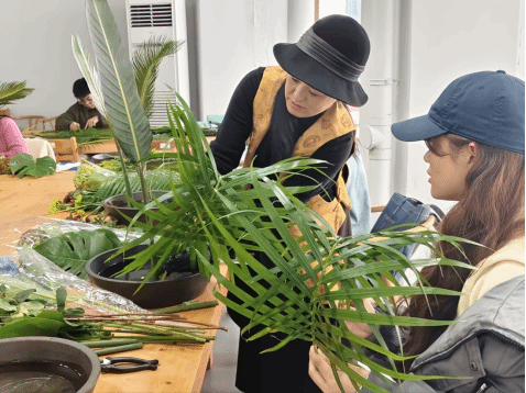 沙龙核心环节为“盆花创作实践”。“看似随意的枝叶摆放,实则暗藏‘疏可走马,密不透风’的章法。”苏老师穿梭于桌间,轻扶学员手腕调整花茎角度:“牡丹菊作为主花需稍向后倾,留出视觉呼吸感;龟背竹叶斜插能打破对称,增添灵动感。”在苏老师的点拨下,一件件作品渐次成型:有的以牡丹菊为中心,配龟背竹叶层叠环绕,如秋日层林;有的用天堂鸟羽叶“划”出弧线,缀以红果芦苇,似山涧流霞。