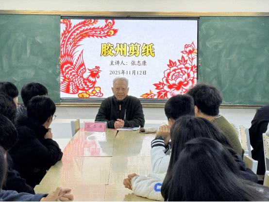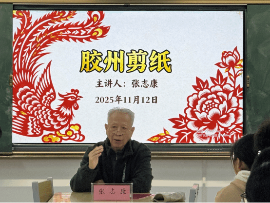 讲座中,张志康先生围绕胶州剪纸的历史渊源、多元风格、鲜明艺术特点及重要历史贡献四大核心内容展开。他结合自身数十年创作与研究经历,用生动的案例、详实的史料,追溯胶州剪纸在岁月长河中的发展脉络,解析其质朴灵动、题材广泛的风格特质,深入剖析剪纸作品中构图、刀法、寓意等方面的精髓,阐释其在民俗传承、文化交流中的重要作用。现场师生听得专注、问得踊跃,在互动交流中深化了对非遗文化的理解与认同。讲座结束后,同学们意犹未尽。
