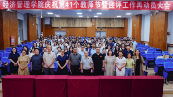 金秋送爽,桃李芬芳。2025年9月10日下午,经济管理学院在2105学术报告厅隆重举行庆祝第41个教师节暨迎评工作再动员大会。学院领导与全院教职员工齐聚一堂,共庆佳节。大会由团总支书记狄继承主持。