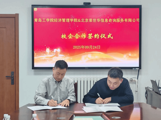 2025年9月24日,青岛工学院经济管理学院与北京荣世华信息咨询服务有限公司校企合作签约仪式在行政楼会议室顺利举行。学校投资方总裁、副校长李伟及招生就业处与经济管理学院负责人、北京荣世华信息咨询服务有限公司经理席华潮、北京汲知教育科技有限公司总经理张静等共同出席本次签约仪式。