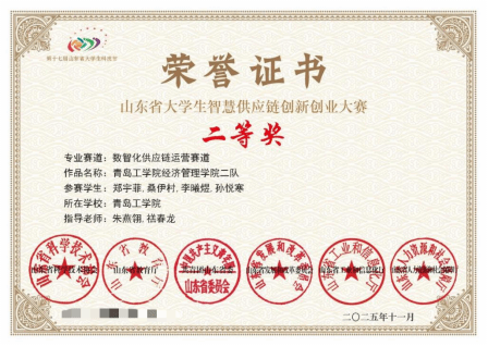 第十七届山东省大学生科技节智慧供应链创新创业大赛于2025年11月1日落幕,我校经济管理学院禚春龙、朱燕翎老师带领“青岛工学院经济管理学院一队”(杜政煊、赵喜超、王敬文、张志远)获得“本科组一等奖”,“青岛工学院经济管理学院二队”(桑伊村、郑宇菲、孙悦寒、李曦煜)获得“本科组二等奖”,“青岛工学院经济管理学院三队”(吴佳炜,赵鑫磊,赵科妍,陈梦涵)获得“本科组三等奖”。大赛由山东省科学技术协会联合山东省教育厅、共青团山东省委、山东省发展和改革委员会、山东省工业和信息化厅、山东省人力资源和社会保障厅共同主办,山东科技咨询协会、济南工程职业技术学院承办,上海百蝶教育科技有限公司、济南华峻科技有限公司提供技术支持。