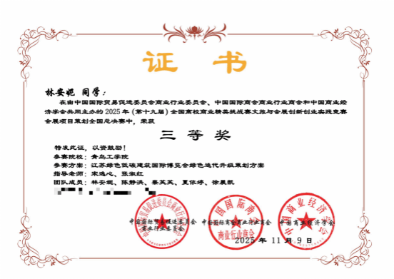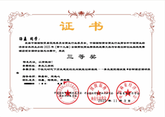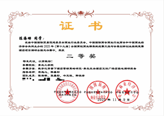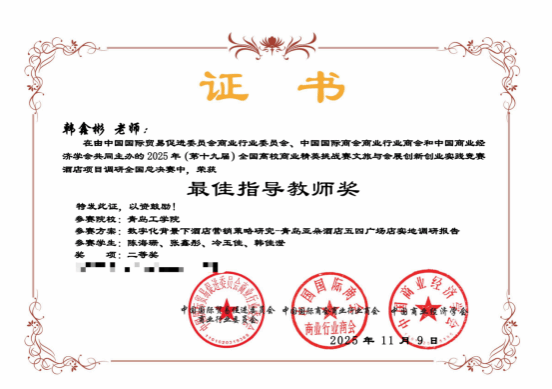 近日,第十九届全国高校商业精英挑战赛文旅与会展创新创业全国总决赛圆满落幕,我校经济管理学院组织的3支学生团队斩获全国总决赛二等奖1项、三等奖2项,青岛工学院荣获“最佳院校组织奖”,韩鑫彬、宋逸心、张淑红获得最佳指导教师奖。
