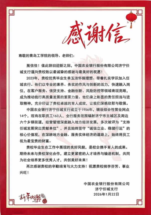 在中国农业银行济宁任城支行的感谢信中,行方特别提到2023年入职的我校金融工程专业优秀毕业生单玉洁,凭借扎实的专业知识、务实的工作作风和积极进取的精神,迅速融入岗位,在客户服务、信贷支持、金融创新、风险防控等多个领域表现优异,成为推动支行高质量发展的重要力量。信中称赞其“彰显了责任担当与进取精神,充分印证了贵校卓越的育人成效”。