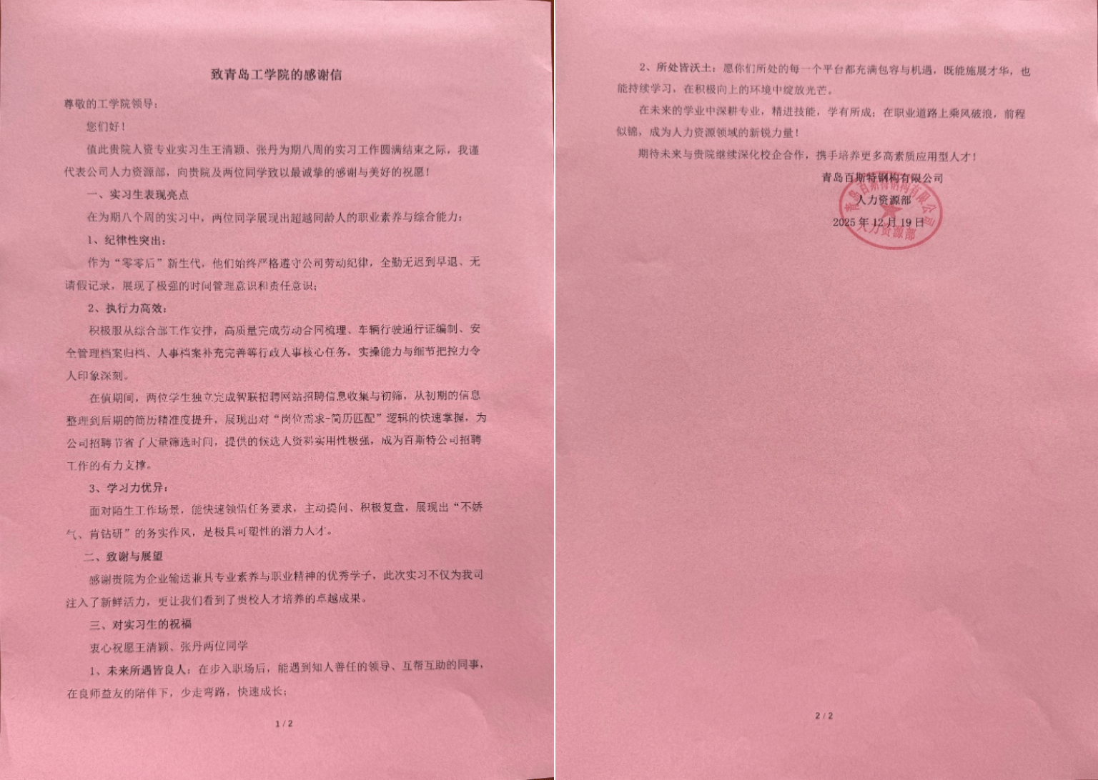 在青岛百斯特公司人力资源部发来的感谢信中,对我校人力资源管理专业实习生王清颖、张丹在为期八周的实习中的出色表现给予高度肯定。两位同学以全勤无迟到早退的记录、高效精准的执行力、快速学习的能力,圆满完成劳动合同梳理、档案整理、招聘信息筛选等多项任务,展现出“零零后”新生代的责任意识与职业素养,成为公司招聘工作中的重要支撑。