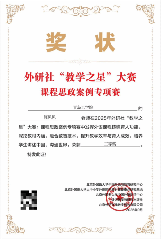 在全面推进高校外语课程思政高质量建设的背景下,青岛工学院的英语教师团队在“教学之星”大赛:课程思政案例专项赛中取得了显著成绩。此次大赛由外语教学与研究出版社主办,以“外语教材的有效使用:讲述中国,沟通世界”为主题,面向全国本科高校英语教师。旨在通过搭建沟通交流课程思政育人实践的赛事平台,全面提升课程思政建设的深入性、创新性与有效性,助力高校服务国家战略、培养堪当民族复兴重任的时代新人。