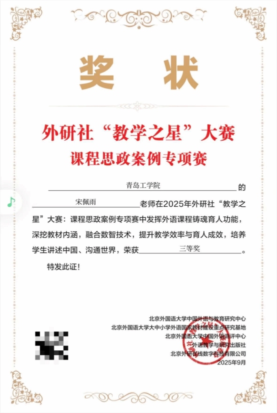 未来,青岛工学院将以此次大赛为契机,进一步总结三位教师的获奖经验,深化外语课程思政改革;同时,学校将继续支持教师参与此类高水平教学竞赛,通过赛事搭建教师专业成长的“练兵场”与“展示台”,以赛促学、以赛促教,不断提升整体教学质量,为培养更多兼具国际视野与家国情怀的优秀人才、助力国家高等教育事业发展做出积极贡献。