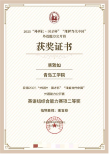 2025年外研社・国才杯“理解当代中国”英语综合能力公开赛是由外语教学与研究出版社主办的国家级赛事,以“紧跟时事热点、创新题型设计”为核心特色。通过多元化的题目设置与贴合时代的话题选择,赛事从语言运用熟练度、逻辑表达严谨性、主题理解深度等多个维度,对参赛选手的英语综合能力进行全面考查。这一赛事不仅为参赛学子搭建了“以赛促学、以赛促练”的实战平台,帮助其在真实竞技场景中夯实语言基础,更引导学子主动拓宽国际视野,深化对当下时代议题的认知,实现专业能力与思想格局的双重提升。回溯此次佳绩的取得,背后离不开我校与学院的双重支撑。长期以来,我校高度重视英语教育工作,商务外语学院则依托优质教学资源,为学子搭建了多元化的实践平台,从课程体系优化、师资力量配备到赛前指导培训,全方位为学子成长保驾护航;同时,这份荣誉更是参赛学子凭借日复一日的辛勤付出与不懈拼搏换来的荣光——在备赛与参赛的全过程中,他们不仅实现了个人英语水平的突破性提升,更在对“理解当代中国”赛事主题的深度探索中,进一步增强了对当代中国文化的理解与认同,真正将赛事“用英语讲好中国故事、传播中国声音”的核心主旨落到实处。