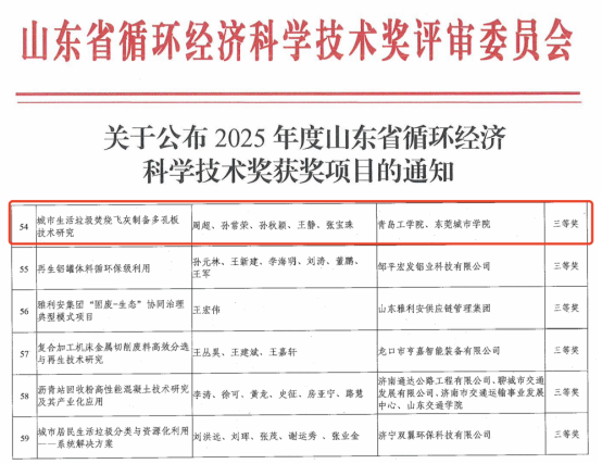 2025年度山东省循环经济科学技术奖评选结果近日正式公布,我院周超老师团队申报的“城市生活垃圾焚烧飞灰制备多孔板技术研究”项目,成功斩获三等奖。这一成果是学院紧扣学校“应用型、地方性、特色化”办学定位,深耕产学研融合的重要突破。