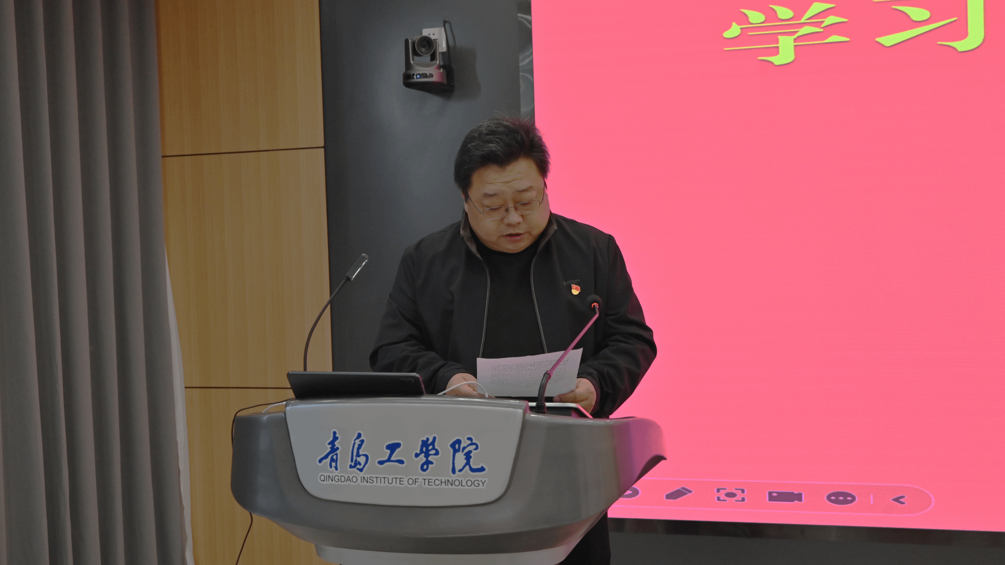 青岛工学院中层领导干部、辅导员代表、马克思主义学院教师,学生干部代表等100余人参加报告会。