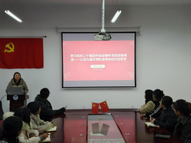为落实青工党办字〔2025〕17号文件《关于党的二十届四中全会精神宣讲工作的通知》要求,推动全会精神入脑入心,2025年12月5日下午,商务外语学院学生党支部于1116党员活动室召开专题学习会。学院宣讲团成员王昕老师主讲,聚焦全会关于党的自我革命的重要论述,衔接商务外语专业育人需求,引导党员在深学细悟中筑牢思想根基,在专业融合中明晰使命担当。